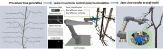 Dormant tree pruning is labor intensive but essential to maintaining modern highly-productive fruit orchards. In this work we present a closed-loop visuomotor controller for robotic pruning. The controller guides the cutter through a cluttered tree environment to reach a specified cut point and ensures the cutters are perpendicular to the branch. We train the controller using a novel orchard simulation that captures the geometric distribution of branches in a target apple orchard configuration. Unlike traditional methods requiring full 3D reconstruction, our controller uses just optical flow images from a wrist-mounted camera. We deploy our learned policy in simulation and the real-world for an example V-Trellis envy tree with zero-shot transfer, achieving a ~30% success rate - approximately half the performance of an oracle planner.